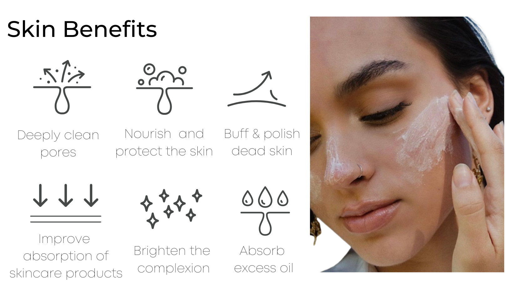 Mix a small amount with your favourite cleanser. Massage into your face for approximately one minute before removing with water or face cloth.